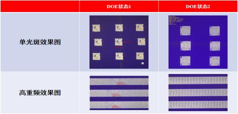 用同一200W绿光皮秒激光器对某些BC电池加工,在与不同状态的DOE配合下,单光斑效果不论优劣,在高重频加工下,效果近乎一致,均为优良。这使得规模化稳定量产变得更加容易实现,单位平方微米需要足够强的能量才能有效地去除材料,随着频率的增加和平均功率的提升,加工效果更为干净彻底。
