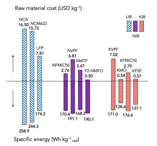 不同技术路线的锂电池(左)、钠电池(中)和钾电池(右)的材料成本和能量密度对比