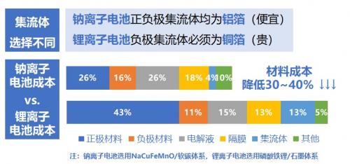 另一方面,钠离子电池成本低、安全性高。据中科海钠的测算,钠离子电池的材料成本,比锂离子电池低30%~40%[4]。并且由于钠电池化学性性能稳定,不容易形成锂枝晶那样坚硬的枝晶,在安全性上较同类别的锂离子电池体系具有优势[5]。