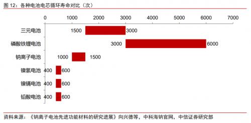 据中信证券的统计,主流的钠离子电池循环寿命仅1000~1500次,只有宁德时代和中科海钠两家的产品寿命可达3000次。这勉强能追平三元电池,但也远不及磷酸铁锂电池。