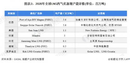 2020年,全球LNG再气化新增产能主要来自巴西,其共有2个浮式再气化终端投入运营,合计新增年产能达1120万吨。同时,2020年全球共完成了4个扩建项目,其中3个在中国,1个在日本,共增加了约580万吨/年的再气化能力。