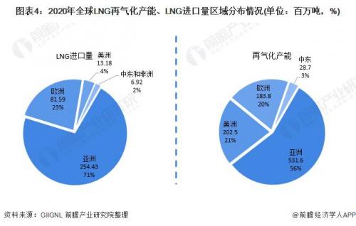 LNG由出口国通过海运运送至进口国后,需要经过“再气化”环节才能进行终端消费。从再气化产能的区域分布情况来看,2020年,亚洲是全球LNG再气化产能最大的区域,年产能达5.32亿吨,占全球份额的56%,这主要是由于亚洲是全球最大的LNG进口地区,2020年进口量占比达71%。