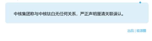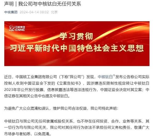 4月14日,中核集团(全称中国核工业集团有限公司)在周日紧急发布声明称,其公司与中核钛白无任何关系。“其一切行为均与我公司无关,我公司对其任何行为依法不承担任何义务和责任”。