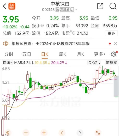 就股价方面来看,自2023年10月以来,中核钛白股价持续走低,于今年2月触及3.18元/股的低点。4月12日,中核钛白下跌1.13%,总市值降至170亿元。4月15日,中核钛白股价大跌10.02%,目前总市值152.9亿元。