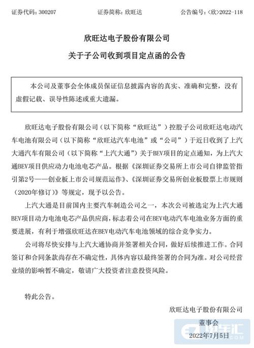 电车汇消息:7月5日,欣旺达电子股份有限公司公告,其控股子公司欣旺达电动汽车电池有限公司于近日收到了上汽大通汽车有限公司关于BEV项目的定点通知,为上汽大通BEV项目供应动力电池电芯产品。合同签订和合同条款的具体内容以最终签署的合同为准。