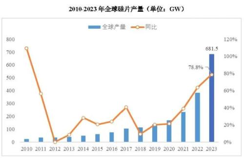2023年,我国大陆硅片产能约953.6GW,同比增长46.6%;产量约668.3GW,同比增长80%,占全球硅片产量的98.1%,在全球硅片领域占据绝对主导地位。