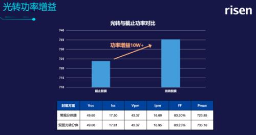 光伏电池技术的不断进步和演变,离不开钝化膜材料和工艺的持续优化,然而随着钝化效果越好,同时也带来了电池更容易受到紫外的影响,TOPCon如此,异质结更是如此。为了消除紫外对电池钝化膜的影响,,东方日升在异质结组件封装领域进行了大量的研究和实验,在继使用高截止型封装胶膜的伏曦1.0产品的基础上,创新性地推出了优化后的“光转膜技术”封装方案,利用光转胶膜可将紫外光变为可见光,不仅保护电池片免受紫外线侵害,还能利用紫外线的能量进一步提升异质结组件的发电增益。通过持续的技术提升和工艺优化,东方日升正向出货组件的功率超过TOPCon 30W以上的目标持续前进。