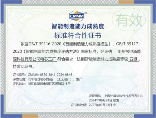 衢州极电工厂是威睿三电的主要生产制造基地之一,于今年9月获得了CMMM四级标准认证,成为浙江省首家“智能制造四级成熟度工厂”,也是全国电芯行业首家获此殊荣的工厂。智能制造能力成熟度标准符合性评估(CMMM)被视为目前国内智能制造领域最具指导意义的行业指南针,是国内智能制造领域最高级别的国家认证。