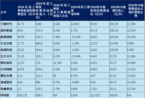 赶碳号根据各家公司三季报、半年报整理梳理完上面这张表,赶碳号有点替一些企业冒汗了。在财务三张表中,出口退税这一项,以“收到的税费返还”的形式,体现在现金流量表中。当然,税费返还不只包括出口退税这样的税收优惠,也包括企业所得税税收优惠返还、鼓励技术创新的增值税优惠等。对于光伏电池组件企业来说,绝大部分是出口退税。