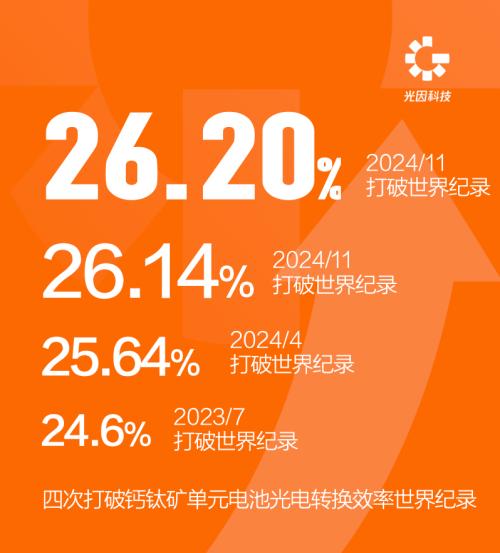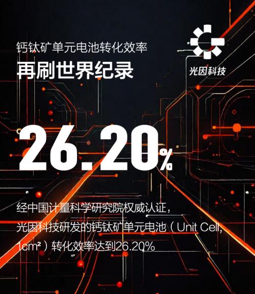 ▶2024年11月,光因科技将钙钛矿单元电池(Unit Cell, 1平方厘米)转化效率提升至26.20%(国家光伏产业计量测试中心)。