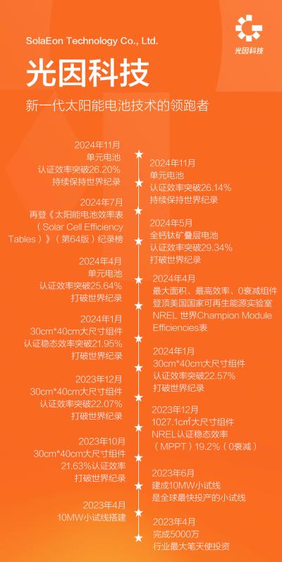 ▶2024年5月,光因科技将全钙钛矿叠层太阳能电池测试转换效率提升至29.34%,打破世界纪录。