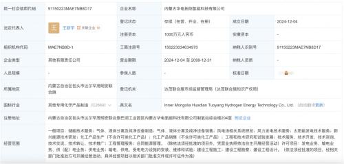 12月4日,内蒙古华电拓阳氢能科技有限公司成立,法定代表人为王新宇,注册资本1000万人民币,经营范围含储能技术服务、风电场相关系统研发、风力发电技术服务、太阳能发电技术服务、新兴能源技术研发等。