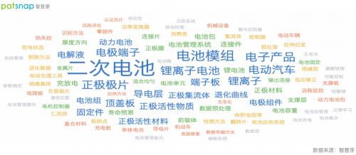 从上述专利文本分析可知,宁德时代近几年的专利布局主要集中于二次电池、电池模组、电子产品、锂离子电池、电动汽车、正极极片、锂离子等专业技术领域(详见图2)。