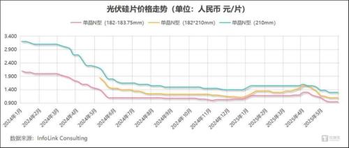 硅片方面,根据InfoLink的最新统计数据,N型182-183.75mm尺寸硅片再次跌破1元线,截至5月底交易均价为0.95元/片,单月跌幅高达14%,年内价格也由涨转跌,较去年末今年初水平低9.5%,与去年同期相比低13.6%,相较去年初水平降幅高达54.8%。