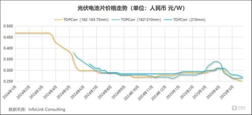 在电池片方面,截至5月末,N型182-183.75mm电池片交易均价单月下跌7.4%,跌至0.25元/W,年内下降10.7%,与去年同期相比低16.7%,相较2024年初降幅达到46.8%。
