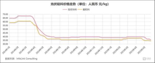此前,硅料环节供需、价格受“抢装潮”影响较小,尤其致密料环节,此前10个多月的交易均价都在39元/kg到40元/kg之间徘徊,月波动幅度不超过3%,市场也多认为其稳价压力相对其他环节较小,但5月却出现意料外的大跌。根据中国有色金属工业协会硅业分会的观察,需求、价格率先走低的制造端下游企业不断加强对原料成本的控制,导致硅料预期采购价格一降再降。经过一段时间的僵持后,产线灵活度较低、库存量较大的硅料环节显现月度累库等问题,随着具有价格优势的库存产品基本出清,部分厂家不得不让价成交,在整体采购节奏放缓,买卖双方均因观望情绪导致大单交易稀缺的情况下,一些落定“小单”的低价也就成为了市场交易的均价。