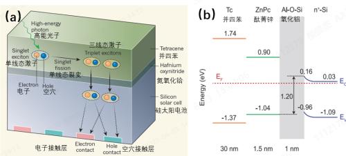 单纯的MEG电池,以及单纯的传统晶硅电池,都存在自身的限制。但将两种材料组合,就有希望进一步突破晶硅电池的理论效率极限。基于这个思路,Einzinger等设计了一种并四苯敏化的BC电池(图1a)[8]。高能光子被并四苯分子吸收,产生单线态激子,并最终分裂成两个三线态激子。激子通过0.8 nm氮氧化铪(HfOxNy)薄膜进入BC电池,最终转化成电流。使用超薄膜层来传输激子的设想最初来源于物理学家David Dexter[9]。超薄膜层能实现有效激子转移,但往往无法实现对晶硅等半导体的有效钝化。Einzinger等工作的亮点在于发现了HfOxNy这种有效的超薄钝化层。虽然Einzinger等制备的太阳电池效率不高,有许多需要优化的部分,但该工作为我们展现了激子倍增材料敏化BC电池巨大的应用潜力(理论效率35%)[10]。2025年5月,Baldo等进一步优化了激子倍增材料敏化晶硅电池结构,相关文章发表在Joule上[11]。该工作的亮点是在并四苯和硅之间引入氧化铝(AlOx)和酞菁锌(ZnPc)。N型硅的导带底和ZnPc的最高分子占据轨道组成的电荷分离态能量为1.2 eV,位于并四苯的三线态能量(1.25 eV)和晶硅的带隙(1.1 eV)之间(图1b),促进电荷从并四苯向晶硅连续传输。1 nm厚度的AlOx用于阻止载流子在晶硅表面复合。最终,并四苯吸收的光子,最高电荷转换效率达到138%,远远超过了传统晶硅太阳电池的量子效率极限。