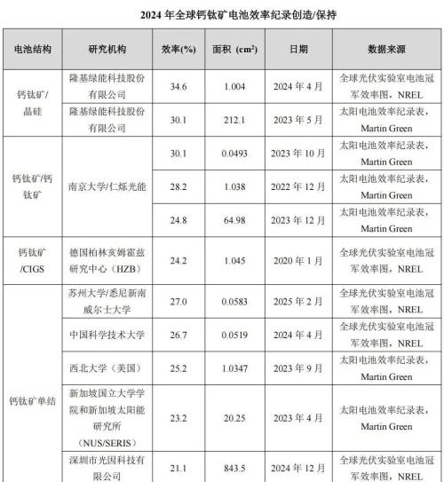 截至2025年2月,钙钛矿/晶硅叠层太阳电池的世界最高纪录效率为34.6%(面积:1.0044 cm2),由隆基绿能(15.920, 0.16, 1.02%)(LONGi)创造;钙钛矿/晶硅叠层小组件的世界最高纪录效率为30.1%(面积:212.1 cm2),由隆基绿能(LONGi)创造;钙钛矿/钙钛矿叠层电池的世界最高纪录效率为30.1%(面积:0.0493 cm2),由南京大学和仁烁光能(NanjingU/Renshine)保持;钙钛矿/钙钛矿叠层大面积电池的世界最高纪录效率为28.2%(面积:1.038 cm2),由南京大学和仁烁光能保持;钙钛矿/钙钛矿叠层微型组件的世界最高纪录效率为24.8%(面积:64.98 cm2),也由南京大学和仁烁光能保持。钙钛矿太阳电池与其他薄膜太阳电池所组成的叠层电池也有相关研究,钙钛矿/铜铟镓硒叠层太阳电池的世界最高纪录效率为24.2%(面积:1.045 cm2),由德国柏林亥姆霍兹中心(HZB)保持;钙钛矿/有机叠层太阳电池的世界最高纪录效率为25.1%(面积:0.0347 cm2),由新加坡国立大学和新加坡太阳能研究院(NUS/SERIS)保持。