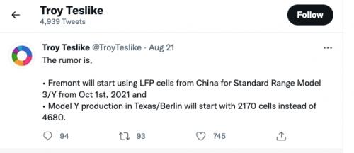 美国当地时间8月21日,Twitter用户Troy Teslike(该用户一直跟踪特斯拉信息)表示,从10月1日开始,特斯拉Fremont工厂生产的标准续航版本的Model 3和Model Y将会使用来自中国的磷酸铁锂电池。此外,该用户还表示,特斯拉位于Texas和Berlin的工厂,率先生产的Model Y将会采用2170电池,而不是4680电池。