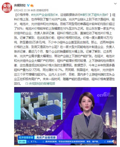 在一家大型太阳能(6.940, -0.11, -1.56%)电池片制造企业,负责人告诉记者,最近几个月,整个企业的销量都在大幅上涨。记者了解到,过去两年,光伏产业需求量大幅增加,带动产业链上下游的产能扩张。在硅片、电池片和光伏组件企业大幅扩产的同时,硅料产能增长相对较慢,上下游结构性供需失衡,这也是造成这轮硅料价格大涨的主要原因。