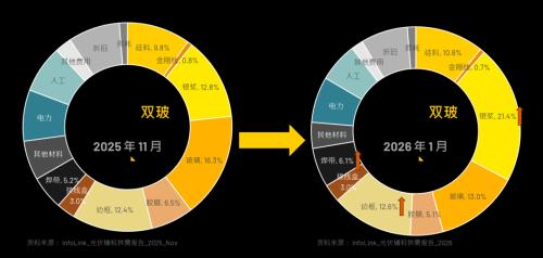 InfoLink在报告中介绍,根据《InfoLink_光伏辅料供需报告》调研,对比2025年11月版本和2026年1月版本辅料在组件中的占比,以TOPCon双玻一体化为例: