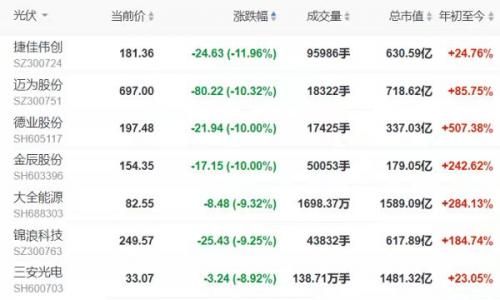 受半年报兑现、产业链价格上涨等因素影响,今日A股光伏板块也出现大面积暴跌。据统计,至午间收盘,德业股份、金辰股份跌停,捷佳伟创、迈为股份跌超10%,大全能源、锦浪科技、三安光电等跌幅较大。