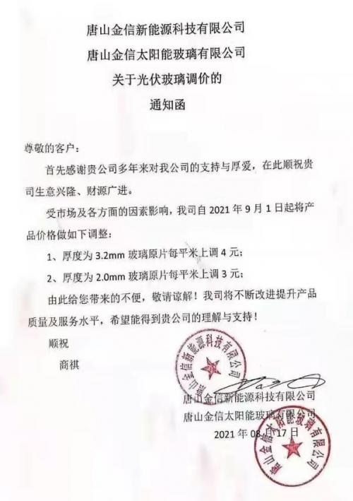 受市场影响,光伏玻璃也开始调价。唐山金信太阳能玻璃有限公司发布关于光伏玻璃调价的通知:受市场及各方面的因素影响,我司自2021年9月1日起价格调整:厚度3.2mm玻璃原片每平米上调4元,厚度2.0mm玻璃原片每平米上调3元。此外,福建台玻及拓日新能源公告,将3.2mm镀膜产品价格上调0.5-1元/平米至23元/平方米。