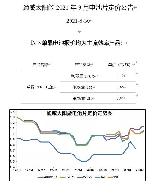 8月30日晚间,通威官网公告更新了9月太阳能电池片指导价,与8月13日公布的数据相比,单晶166电池和210电池片价格分别上调了0.02元/W和0.03元/W。