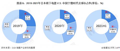 2021年上半年,宁德时代的市占率为25.60%,位列全球第一,松下电器的市占率为17.7%,位列全球第三。