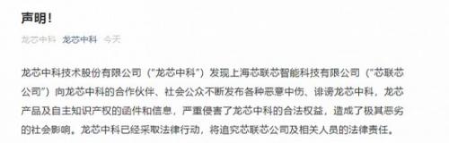 6月2日消息,龙芯中科技术股份有限公司在官微发布声明,称上海芯联芯智能科技有限公司(“芯联芯公司”)向龙芯中科的合作伙伴、社会公众不断发布各种恶意中伤、诽谤龙芯中科,龙芯产品及自主知识产权的函件和信息,严重侵害了龙芯中科的合法权益,造成了极其恶劣的社会影响。龙芯中科已经采取法律行动,并将追究芯联芯公司及相关人员的法律责任。