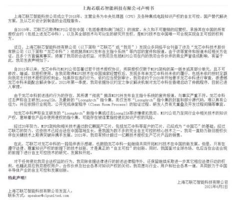 此前,芯联芯公司发表声明称,芯联芯公司已取得MIPS技术在中国唯一可合规实现自主可控的权利,而龙芯中科存在违反MIPS若干技术授权协议的行为,芯联芯已经在香港启动仲裁程序,目前进入审理阶段。