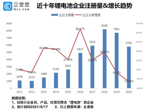 企查查数据显示,目前我国现存锂电池相关企业共4.74万家,近10年来,锂电池相关企业注册量整体呈上升趋势。2016年,国家一系列锂电池行业的政策新规陆续公布实施,当年新增锂电池企业4917家,同比增长88.17%,是近十年同比增长最快的一年。2018年新增8198家,同比增长38.41%。是近十年来新增锂电池企业最多的年份。2019年、2020年分别新增锂电池相关企业7691家、5764家。
