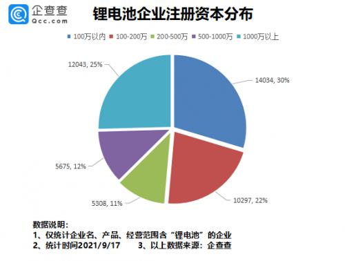 锂电池相关企业注册资本分布:1000万以上的占比25%