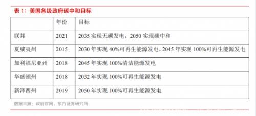 美国设定2035年实现无碳发电,2050年实现碳中和的目标。美国作为当前世界第一大经济体,是一个碳排放大国。减少碳排放、加快能源转型势在必行。拜登在领导人气候峰会上宣布,到2030年将美国的温室气体排放量较2005年降低50%,到2035年通过向可再生能源过渡实现无碳发电,到2050年实现碳中和目标;并呼吁各国采取坚决行动,力争将全球平均气温较工业化前水平提高控制在1.5摄氏度内。各州政府也陆续提出100%可再生能源计划,要求在2030-2050年间,逐渐达成100%清洁能源发电。