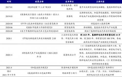中国自2001年起确立了“863计划电动汽车重大专项”项目,确定了三纵三横战略,以纯电动、混动和燃料电池汽车为三纵,以多能源动力总成控制、驱动电机和动力蓄电池为三横。随着燃料电池产业发展逐渐成熟,中国在燃料电池领域的规划纲要和战略定调已经出现苗头,支持力度逐渐加大。在2019年政府工作报告里,有一条“推动充电、加氢等设施建设”,这是氢能源首次写入《政府工作报告》,氢燃料电池的发展进入新的阶段;2020年9月,财政部、发改委等五部门联合印发燃料电池示范应用通知,对燃料电池汽车的购置补贴政策,调整为燃料电池汽车示范应用支持政策,即所谓的“以奖代补”,并进一步明晰了对燃料电池汽车商用及氢能供应的奖励。