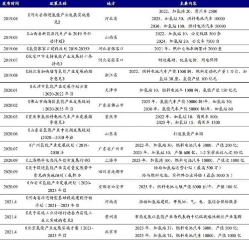 各地政府积极出台氢能产业链的补贴政策。地方政策出台较多的区域主要集中在北京、上海、广东、河北、山东等区域,主要聚焦在氢燃料汽车(主要为城市公交大巴车和物流车)的推广、燃料电池核心技术研发、加氢基础设施建设以及氢能示范城区的打造。
