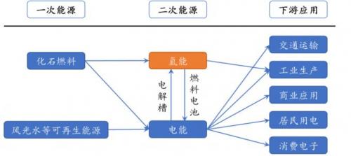 在全球碳中和的框架下,氢能的环保性以及可再生性,使其具有举足轻重的作用。鉴于其种种优势,在新能源体系下,氢能被视为与电能相互补的优质二次能源,目前的分布式能源中,已形成“风光发电-多余电量电解水制氢-氢气储存-利用燃料电池发电”较为完整的能源转换链条,氢作为能量储存的载体形式,有效减少了偏远地区弃风弃光的现象。