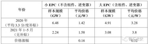 通过对2020年、2021年1~5月大量地面电站EPC的中标价格来看,近期EPC价格出现的全面的上涨,如下表所示。
