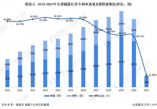 在专利授权方面,2010-2020年全球储能行业专利授权数量同样呈现先上升后下降的趋势。2020年全球储能行业专利授权数量为9545项,授权比重仅为49.17%。