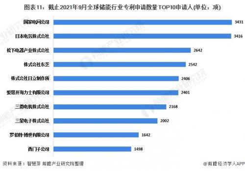 其中,国家电网公司储能专利申请数量最多,为3431项。日本电葜晔交嵘缗琶第二,其储能专利申请数量也超过了3400项。