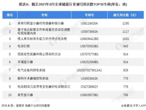 具有印刷显示器的传感器和指示器(专利号:US6118426A)和基于观众配置文件和观看历史动态调整电视观看内容(专利号:US5973683A)是被引用次数最多的两大储能专利,两者被引用的次数均超过了1000次。其他被引用次数前十大专利如下所示: