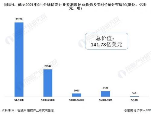 目前,全球储能行业专利总价值为141.78亿美元。其中,3万美元以下的储能专利申请数量最多,为73209项;其次是3万-30万美元的储能专利,合计专利申请量为26942项。3百万美元的储能专利申请数量最少,为561项。