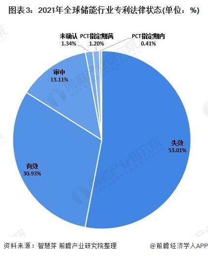 目前,全球储能大多数专利处于“失效”和“有效”状态,“失效”和“有效”专利总量分别为13.89万项和8.10万项,占全球储能专利总量的53.02%和30.93%。