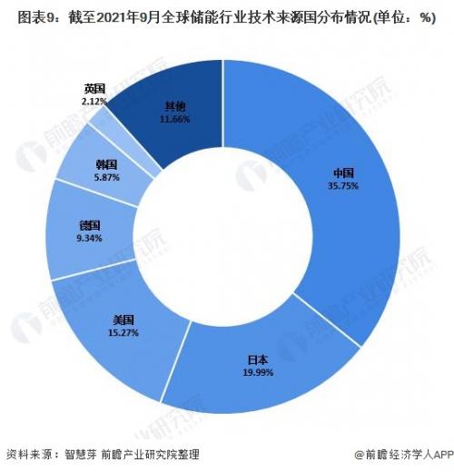 目前,全球储能第一大技术来源国为中国,中国储能专利申请量占全球储能专利总申请量的35.75%;其次是日本,日本储能专利申请量占全球储能专利总申请量的19.99%;美国专利申请量排名第三,占比为15.27%。