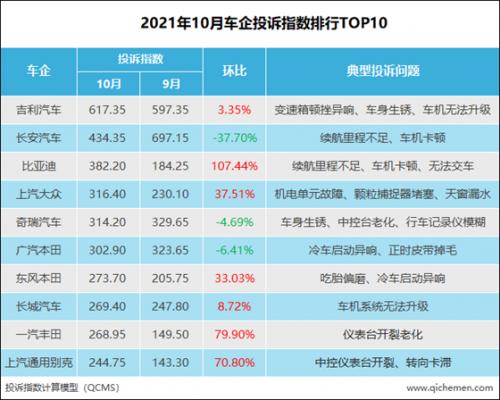 2021年10月车企投诉指数显示,因长安UNI-T投诉回撤长安汽车投诉指数大幅下滑,吉利汽车重回首位,博越、帝豪、帝豪L等多款车型遭遇集中投诉,变速箱顿挫异响、车身生锈、车机无法升级成为投诉焦点;长安汽车排名第二,奔奔E-Star这位集中投诉继任者,续航里程不足被广泛关注;比亚迪升至第三位,汉、宋PLUS新能源、比亚迪e5分别因车机、交付、续航遭遇集中投诉。