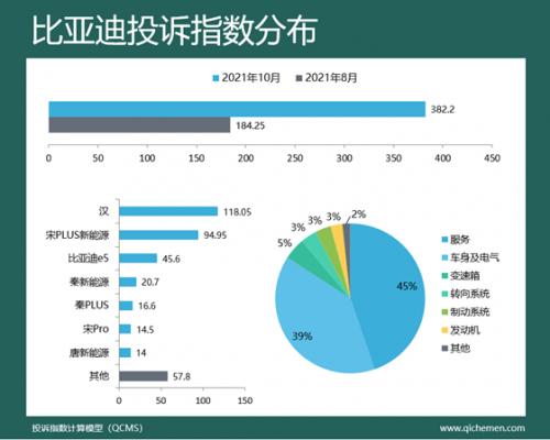 汽车质量投诉点评:比亚迪本月升至第三位,投诉问题集中于服务、车身及电气层面,分别占比45%、39%;比亚迪汉因5G车机与宣传不符、宋PLUS新能源受订单量大芯片短缺无法交车、比亚迪e5续航里程下降遭遇集中投诉。