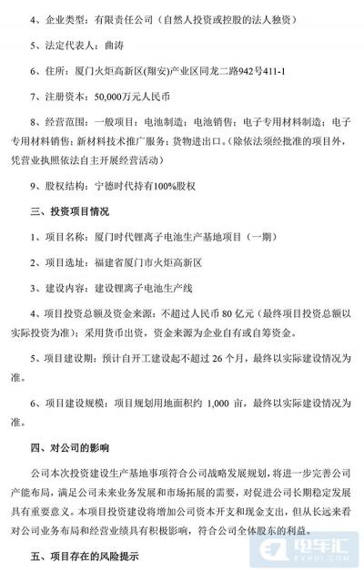 具体来看,宁德时代拟在福建省厦门市投资建设厦门时代锂离子电池生产基地项目(一期),项目总投资不超过人民币80亿元,规划用地面积约1,000亩,建设期不超过26个月,实施主体为厦门时代新能源科技有限公司;