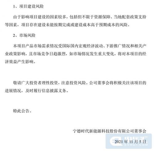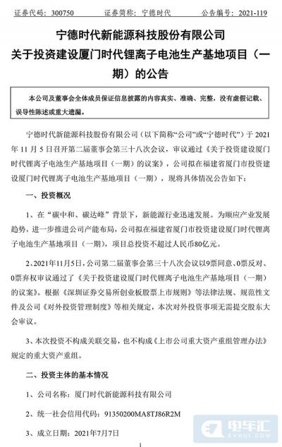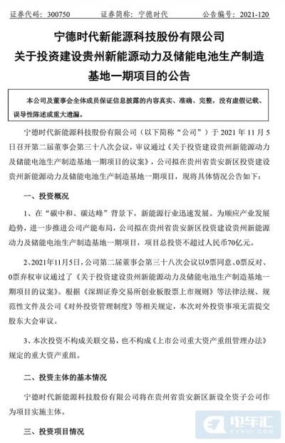 电车汇消息:11月6日,宁德时代发布公告,在“碳中和、碳达峰”背景下,新能源行业迅速发展。为顺应产业发展趋势,进一步推进公司产能布局,公司拟总投资不超150亿元在福建和贵州投建新项目。