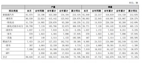 比亚迪10月乘用车总销量为88898辆,同比增长90.9%,其中新能源汽车销量为80003辆,同比增长262.9%,再创历史新高。