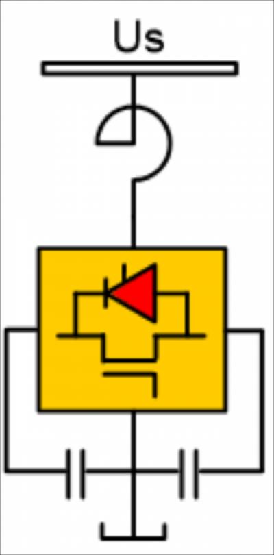 SVG型无功补偿装置是一种采用IGBT全控型有源型无功发生器,不再采用大容量电容器和电抗器,而是通过电力电子器件开关功能实现无功能量的转换,能动态发出和吸收无功功率,SVG功率模块是由多个IGBT元器件与电容器串并联而成的桥式电路,通过电抗器并联在电网上。电抗器能有效的抑制SVG开关电路产生的谐波,使SVG输出的无功功率无阶跃波动更加平滑,防止电流冲击发生故障。SVG原理示意图如下所示: